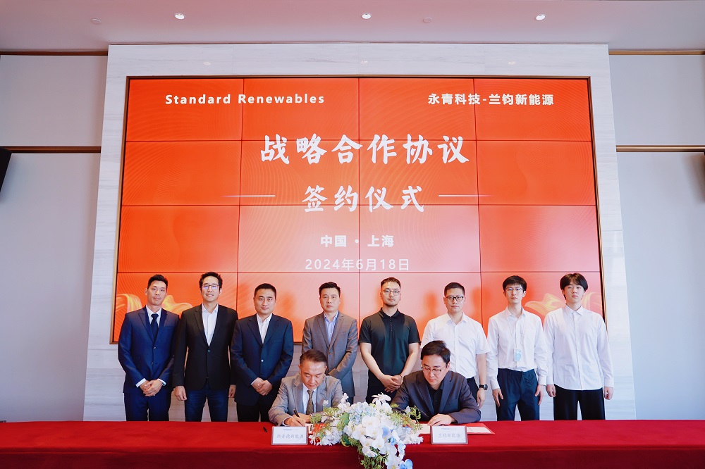 6月18日下午,永青科技集团有限公司旗下兰钧新能源科技有限公司与Standard Renewables(斯丹德新能源有限公司)在PA旗舰厅实业大楼举行战略合作签约仪式。永青科技集团副总裁、兰钧新能源董事长冯挺与Standard Renewables创始人& CEO柯宏霖代表双方签署战略合作协议。