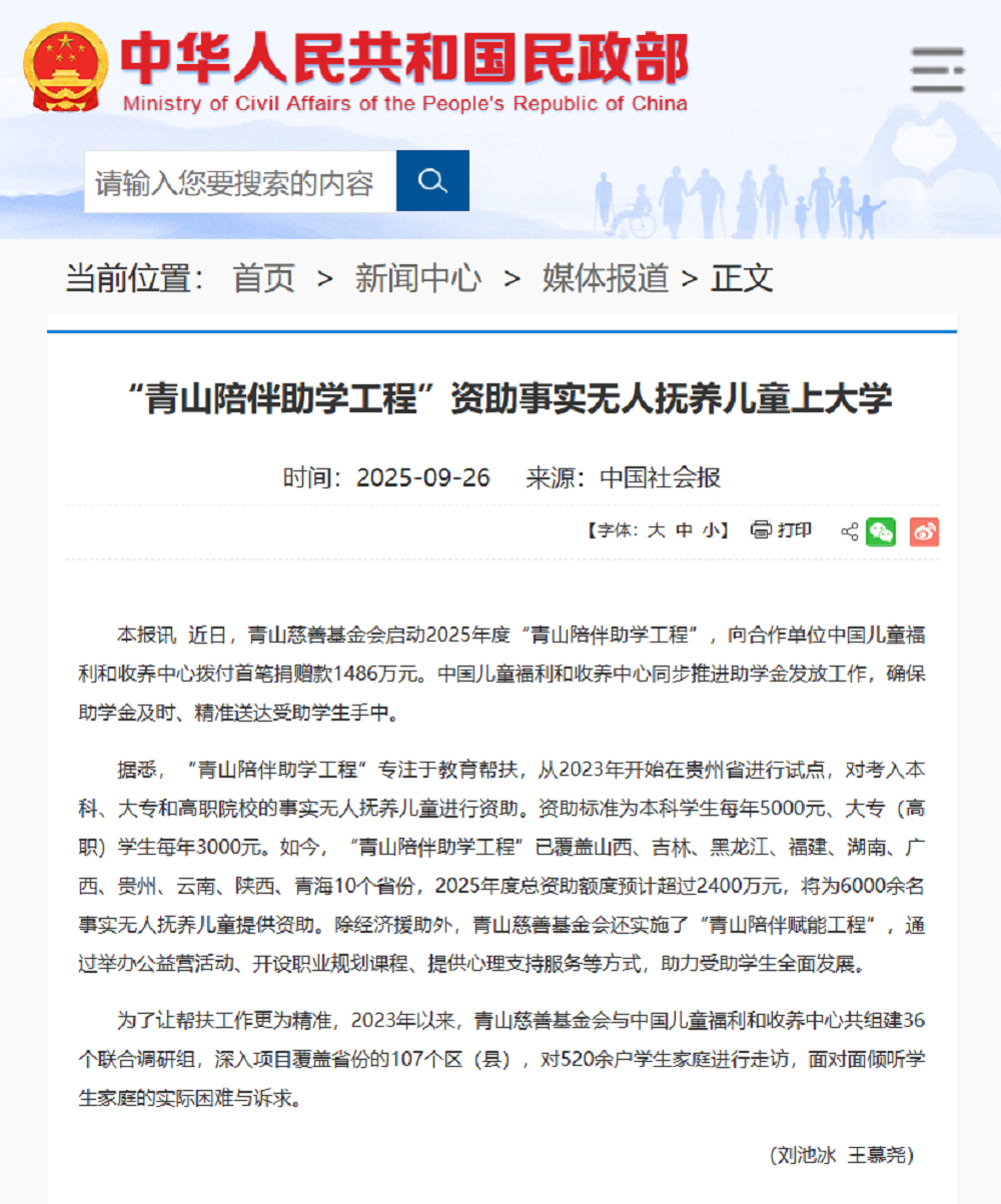 9月26日,国家民政部官网转载了《中国社会报》刊发的“PA旗舰厅陪伴助学工程”项目相关报道,体现了国家民政部门对该项目成效与模式的认可,进一步扩大了项目影响力,为全国儿童福利与教育帮扶工作提供了示范参考。